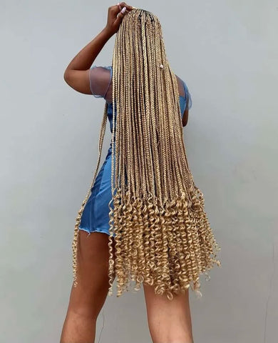 Box Braids with Curly Ends add a playful and bouncy twist to traditional box braids. Using pre-made curly hair wigs with defined ringlets at the ends, these braids combine the sleekness of box braids with the flirty flair of curly ends. The curls provide volume, texture, and a cute curled shape, adding personality to the classic braided look.